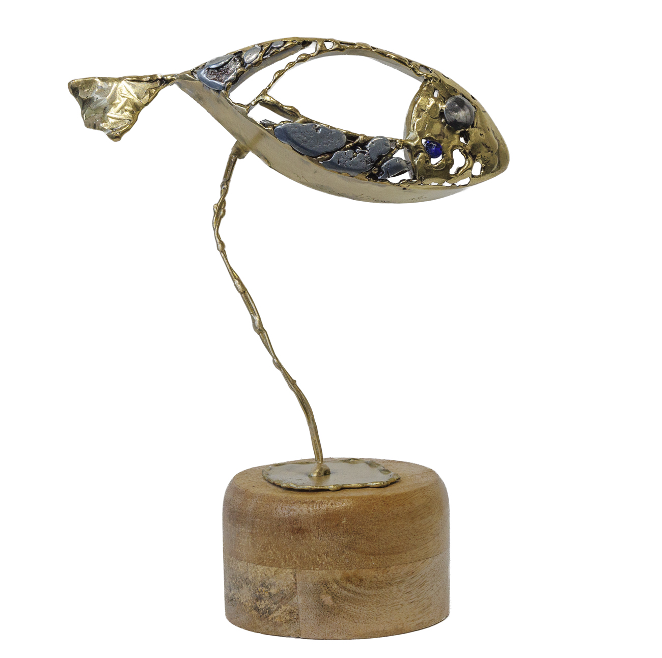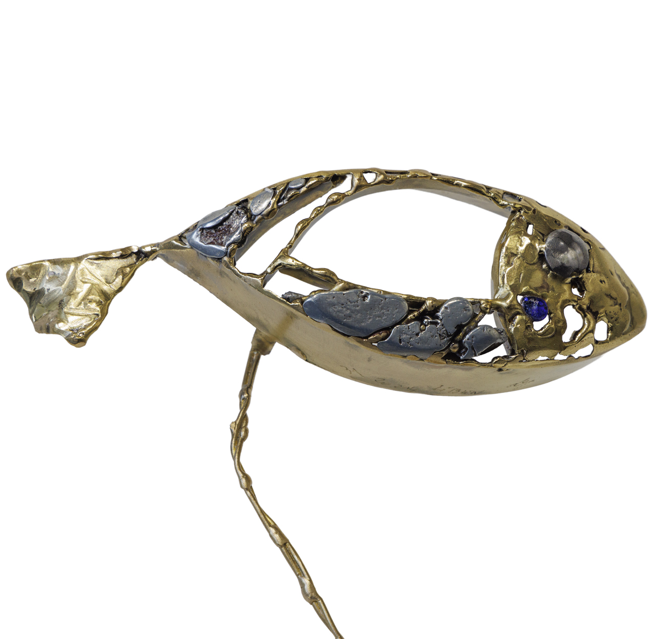 « Poisson à l’écaille bleue – Série Rapa » – Sculpture poisson en laiton forgé, verre et résine