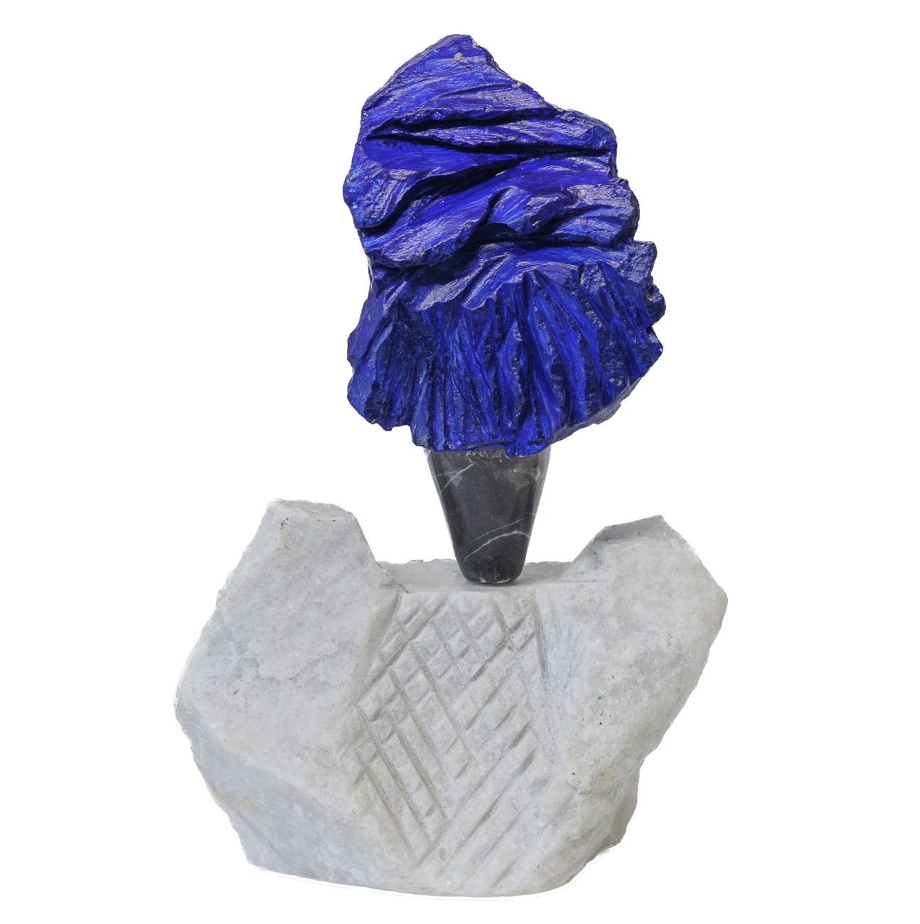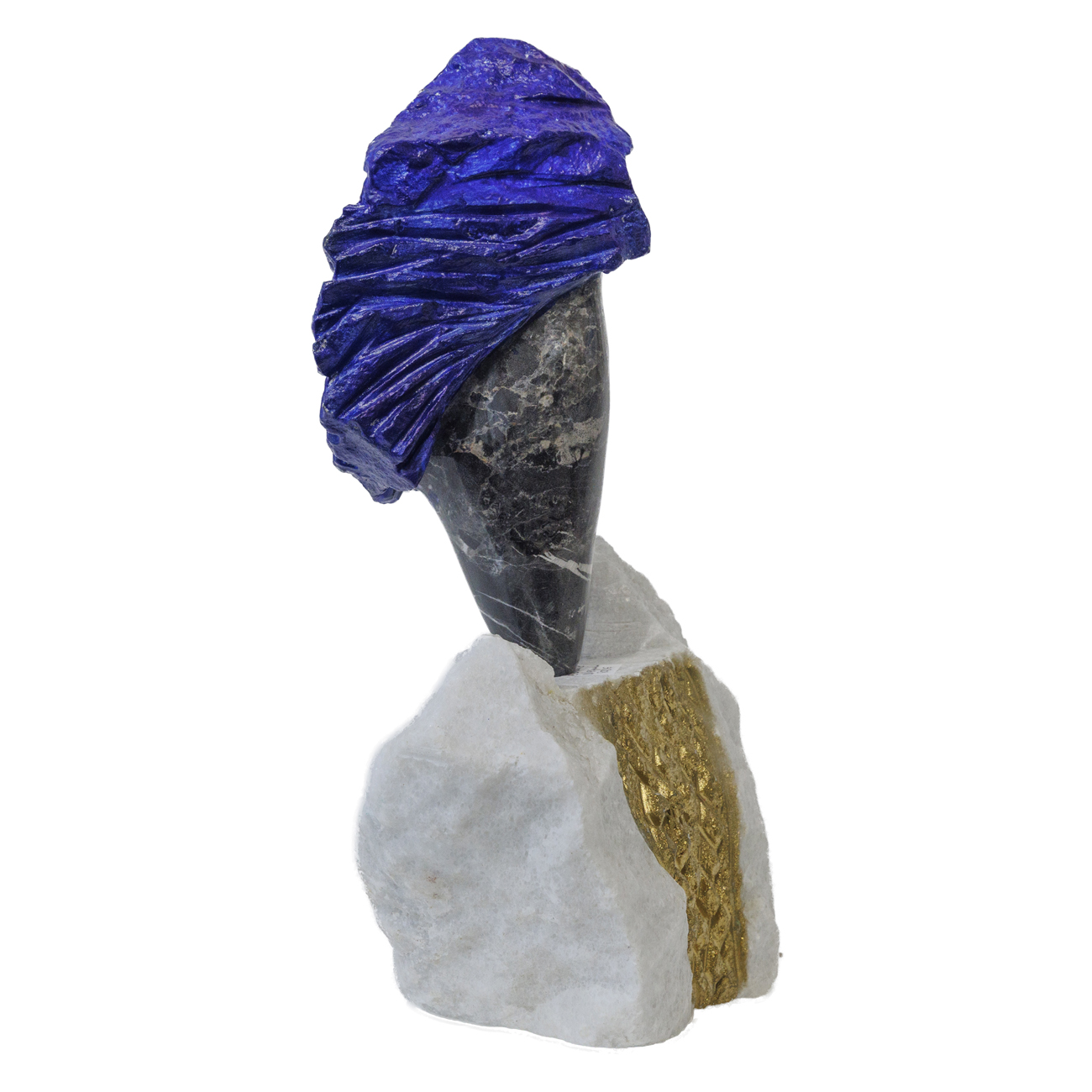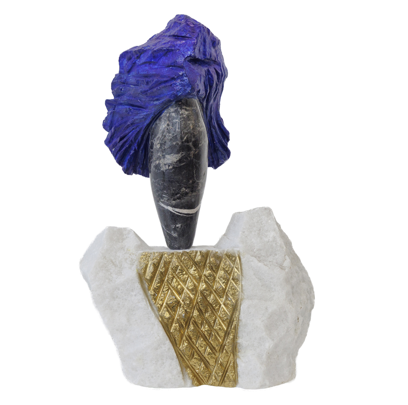 « Buste Arlequin » – Sculpture marbre blanc et noir et pigment bleu