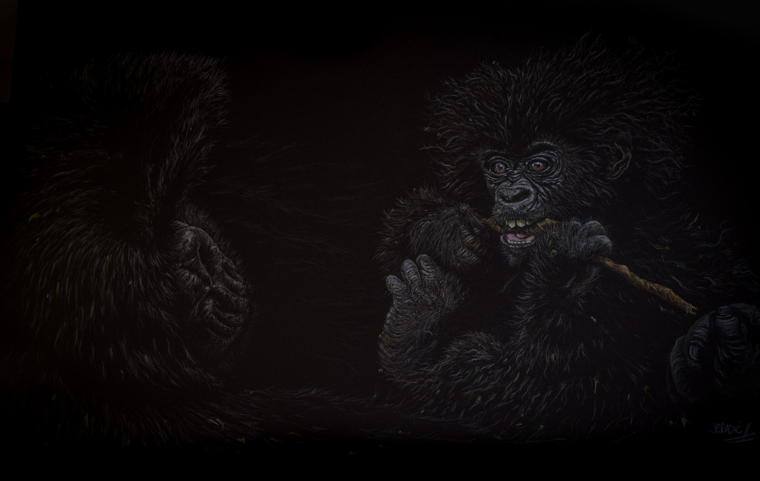 « Jeune Gorille » – Crayon de couleur sur papier canson noir
