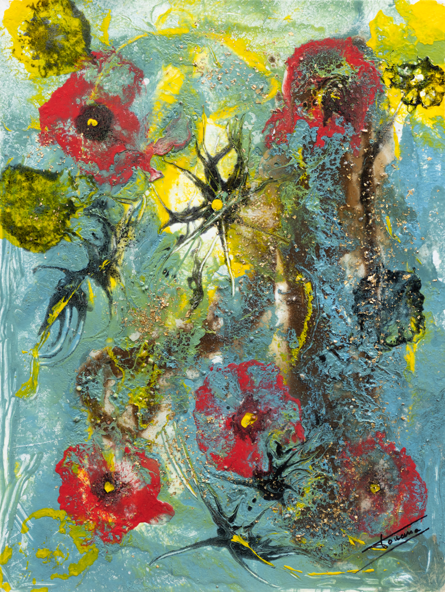 « Coquelicots » – Acrylique liquide, paillettes et résine
